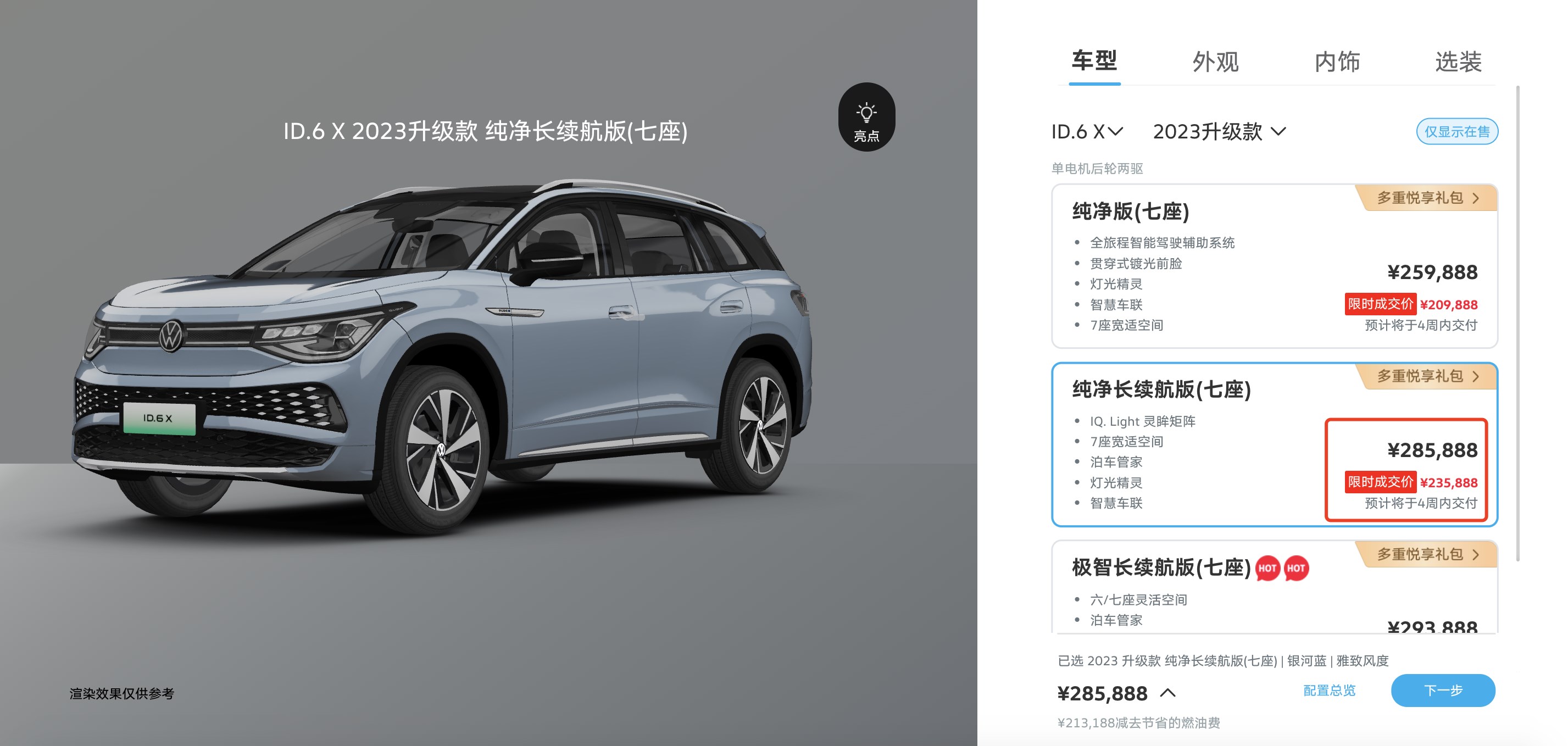 動力續(xù)航上,ID.6 X提供多種性能、續(xù)航版本,主銷車型配備寧德時代三元鋰電池,容量為83.4千瓦時,支持0.67小時快充,最高續(xù)航617公里。同樣,作為ID.家族旗艦級SUV,上汽大眾為ID.6 X推出限時優(yōu)惠,綜合優(yōu)惠至高5萬元。從官網(wǎng)顯示,ID.6 X長續(xù)航版指導(dǎo)價28.5888萬元,限時優(yōu)惠價格23.5888萬元,25萬元落地一款6座純電中大型SUV,是不是很誘人?
